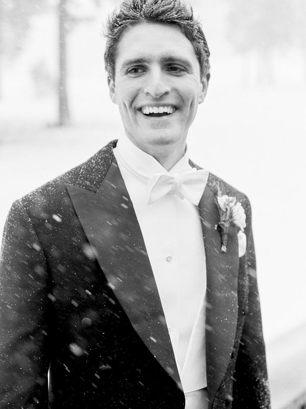 El novio también puede incluir sutiles detalles que evoquen la temporada invernal en su botonier.
