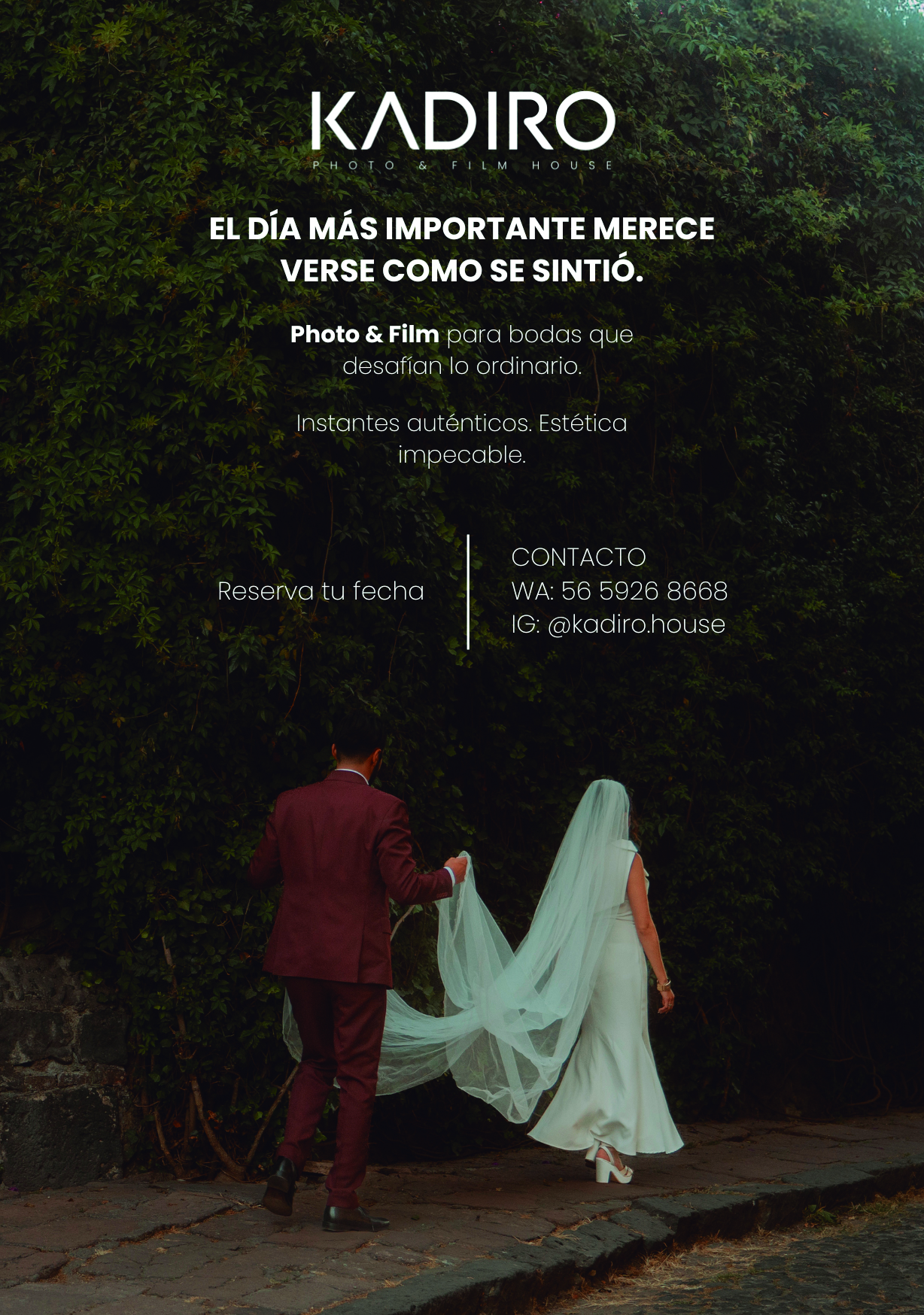 Kadiro | Photo & Film Kadiro | Photo & Film En Expo Tu Boda STAND 106 Datos de contacto 56 5926 8668 Redes sociales /kadiro.house « Arckeia Photo Studio Kora & Beth »